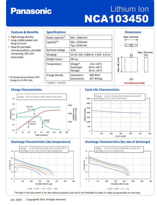Here 10 packs of used but testing 90% or better capacity Panasonic NCA103450 lithium ion cells. These are awesome cells and perfect for a variety of applications. The cells in particular don't have shrink wrap on them. You can use kapton tape, shrink wrap, etc. Or if you build them into parallel packs you don't need the wrapper at all. These were extra cells left over from a huge battery pack assembly project.