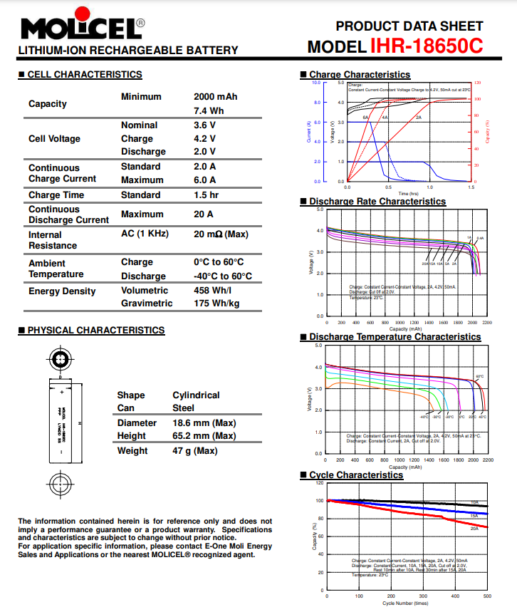 100x Molicel IHR-18650C 3.6v 2000mah (10c/20a) Power Cells