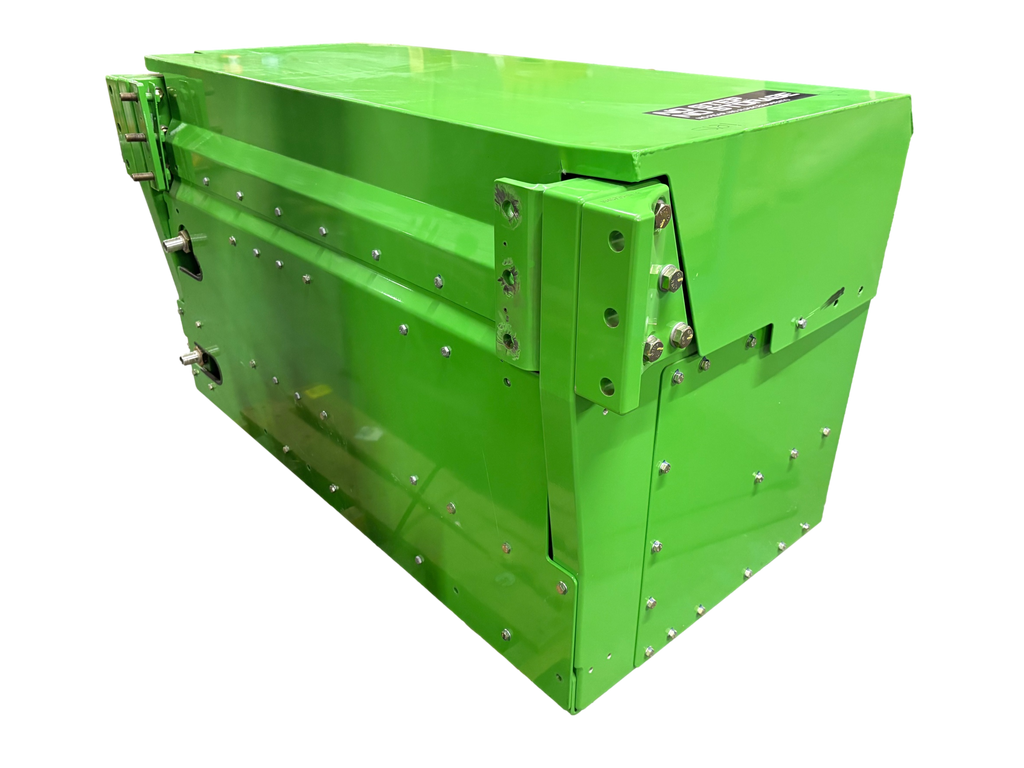 The enclosure can be opened with bolts to get to the battery modules inside. There are 3 layers of battery modules inside each containing 63 cells with 3 rows of 21 cells in series for each battery.