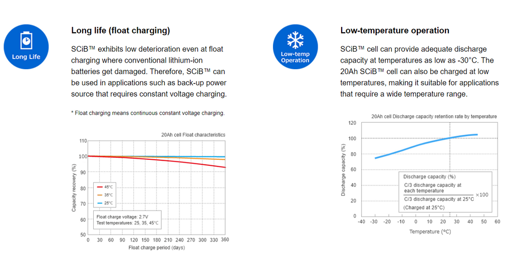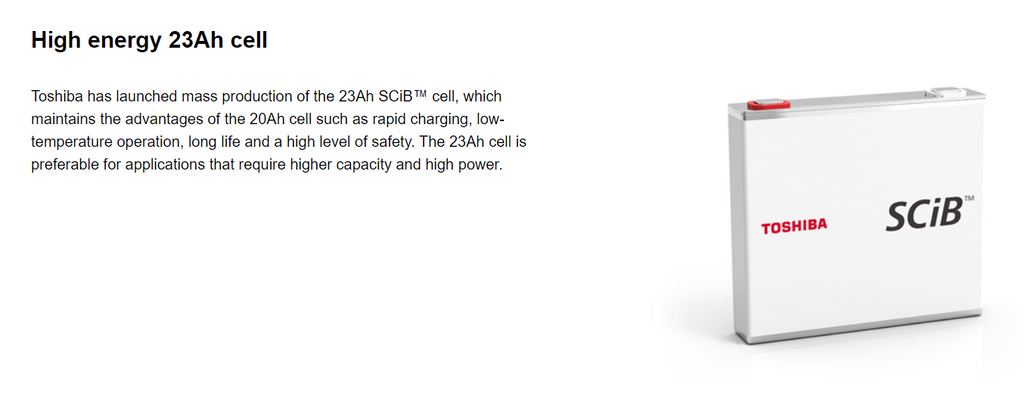 Brand new boxes of 16 Toshiba SCiB LTO cells for just $15 per cell. These are the 23ah version cells that are rated for over 20,000 cycles and can be charged and discharged over 430 amps per cell which is almost a 20c rating. At 202wh/L these are a perfect balance of power and energy density. To make it simple each cell can be charged and discharged at 1000w.