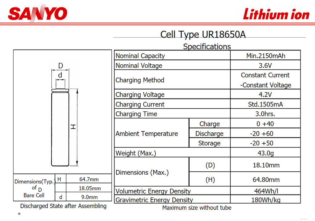 Here are nice medical packs to salvage good quality and name brand Sanyo UR18650A cells. These are the good model of Sanyo cells. These packs are for salvaging the cells since the BMS is proprietary it is unlikely you will be able to reuse it. The best part of medical packs is that they usually get swapped out after just a year or two of use and the cells still have a lot of life left in them. Also for those of you that like to salvage gold from boards, medical packs tend to gold plate the connections so you should be able to get some value there as well. Also you'll get some wires and a 6 pin connector. I don't know what the connector name is on this. In the end you get great cells for 50 cents and some extra accessories to sweeten the deal. These packs are a little hard to crack open, you have to crack them at the seam and when you get the lid off there is some double sided foam tape under the cells but with a good plastic pry tool you'll be able to get them out. Not the easiest packs to salvage cells from but definitely not the hardest and the cells do come out clean so no glue or any crap like that after you win the battle with the plastic case. Photos 4 and 5 show the spec sheet for the Sanyo cells. You can discharge these continuous at 4.3a per cell and of course they have all the usual parameters. Charge up to 4.2v and discharge down to 2.8v. I recommend max continuous charge of 1c (2.15a) and max continuous discharge of 2c (4.3a). The cells are currently in 4s5p so they are set up at 14.4v nominal.