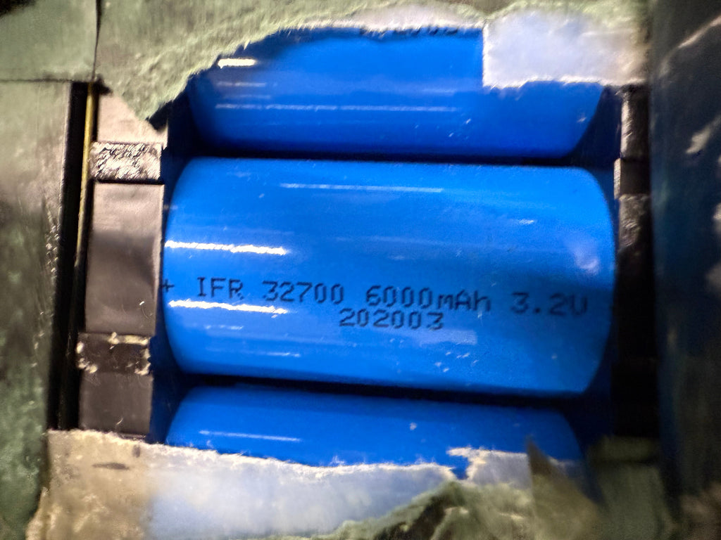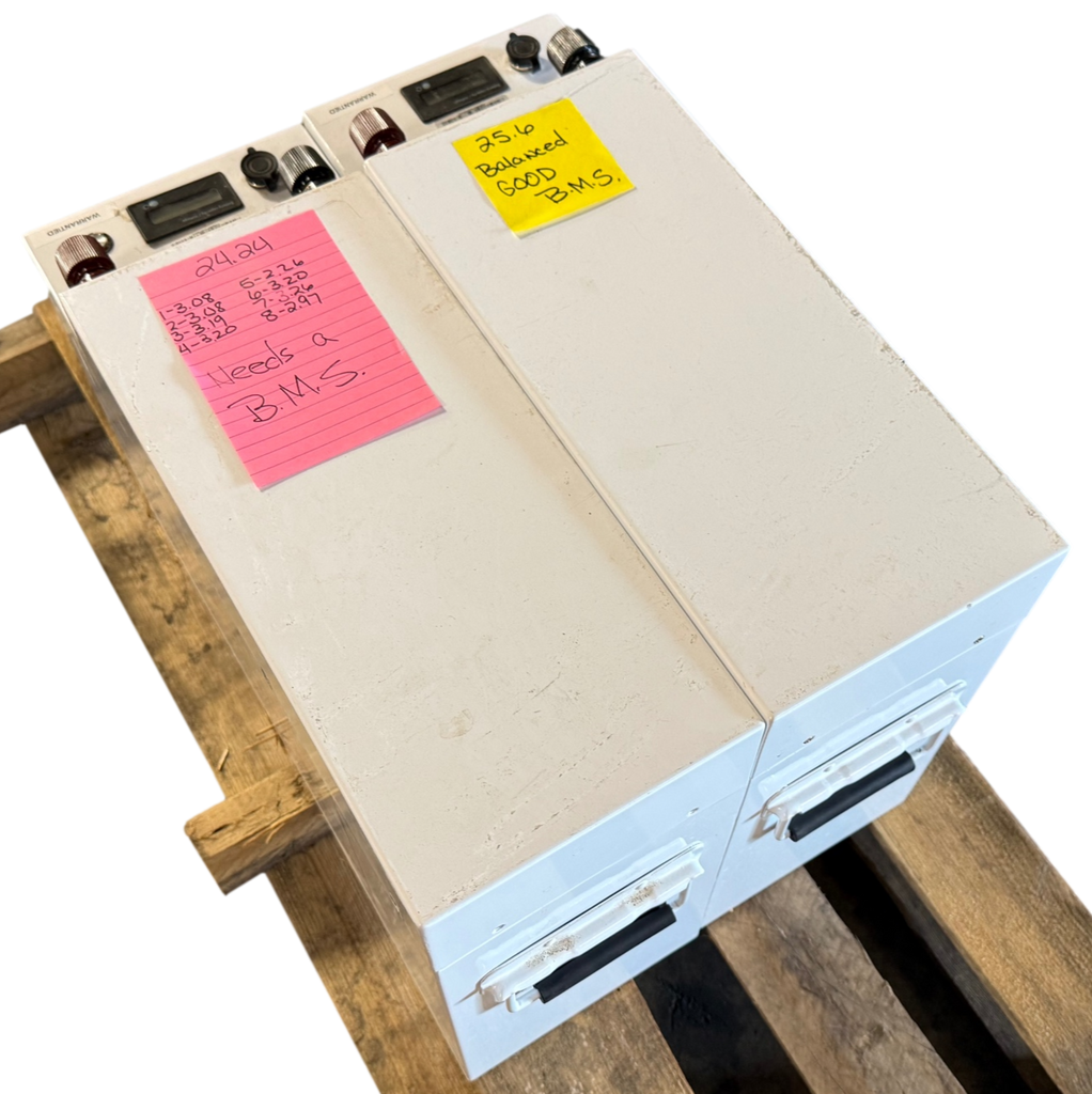 Here are 2x 25.6v 150ah Lifepo4 batteries. They use IFR 3.2v 6000mah 32700 cells inside. We wrote the voltages of each series of cells on top of the batteries as you can see in the photos. 1 battery is fully balanced and has a good BMS. That one is plug and play. The other battery has all good cells, they just need to be balanced. That one needs a 8s BMS however after balancing the BMS may work again once reset. Total of 7.68kWh of good batteries with one just needing a BMS. It's possible you could top balance them and add one overall 16s lifepo4 BMS for a 48v system.