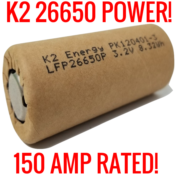 Here are 65 brand new K2 LFP26650P Lifepo4 batteries. These are 2600mah cells that can put out 150 amps in a short 10 second burst. 4 of these in series actually started a car! Lifepo4 is a superior chemistry with over 2000 cycles to 80% capacity. Compare that to lithium ion and lithium polymer 300-800 cycles. These also make a perfect 12v lead acid replacement when you connect 4 in series. Check out the amazing specs below! We tested hundreds of these and they all checked within 5% of new specs so they are super consistent and stored at nominal voltage. Priced to sell fast! These are overstock from a large military application. K2 is a brand trusted by the medical and military industry.