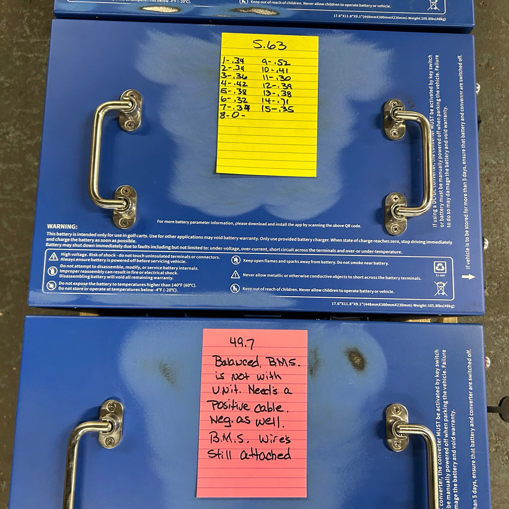This is for 3 batteries each with 15x 3.2v 105ah cells inside. 2 of the batteries have a BMS as well. It seems like you will be able to use the BMS from one and add it to the battery that is balanced with good cells to get a working battery. One battery is fully discharged. The other battery has 14 cells out of 15 with some voltage. Those cells may cycle fine but the cells that are 0v likely will have self discharge issues. You will get at least 15 good cells in this lot, 14 cells likely will be OK as well, so perhaps 29x 3.2v 105ah cells will be good for reuse. You also get 3x metal enclosures which are easy to open with just bolts, they are weather proof, and you also get 2x BMS units that work.