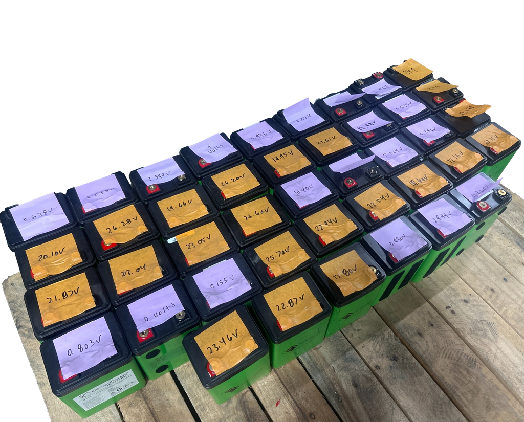 This auction is for a mix of 42x 12v and 24v K2 lifepo4 batteries. Each battery has a BMS and most of the BMS units are in working condition. Each of the batteries has some issue. Mostly they have swelling however the cells inside are 3.2v 2300mah 26650 cells. Over time gas builds up inside the enclosure and since the plastic is thin it expands a little. As you can see we wrote the voltages on top of each battery. The one says bad BMS. Some show low voltages which is likely from some bad cells inside. Most have good voltage but have swelling which usually indicates some cells inside may not be good for reuse. Overall the BMS units are very valuable, a lot of good cells, and enclosures.