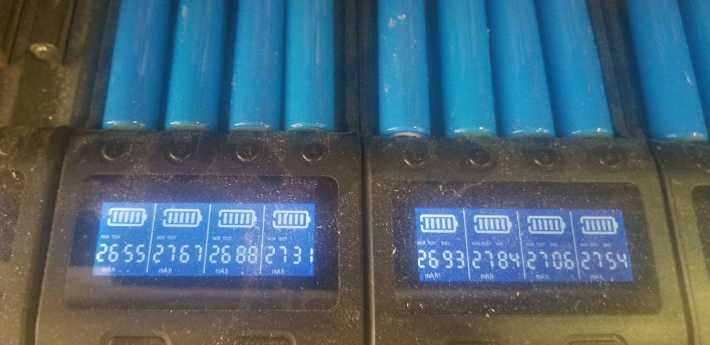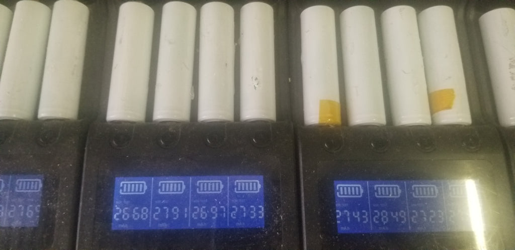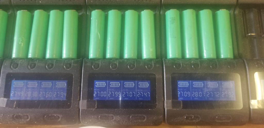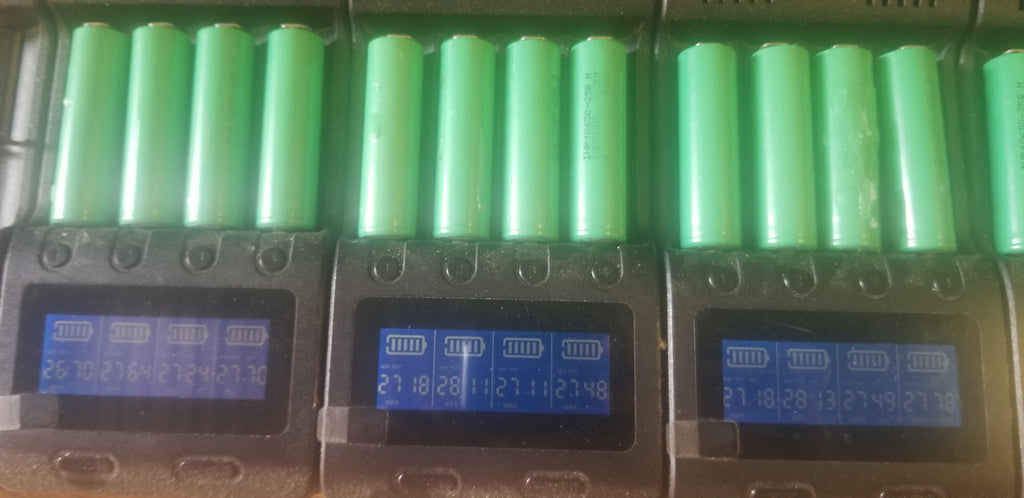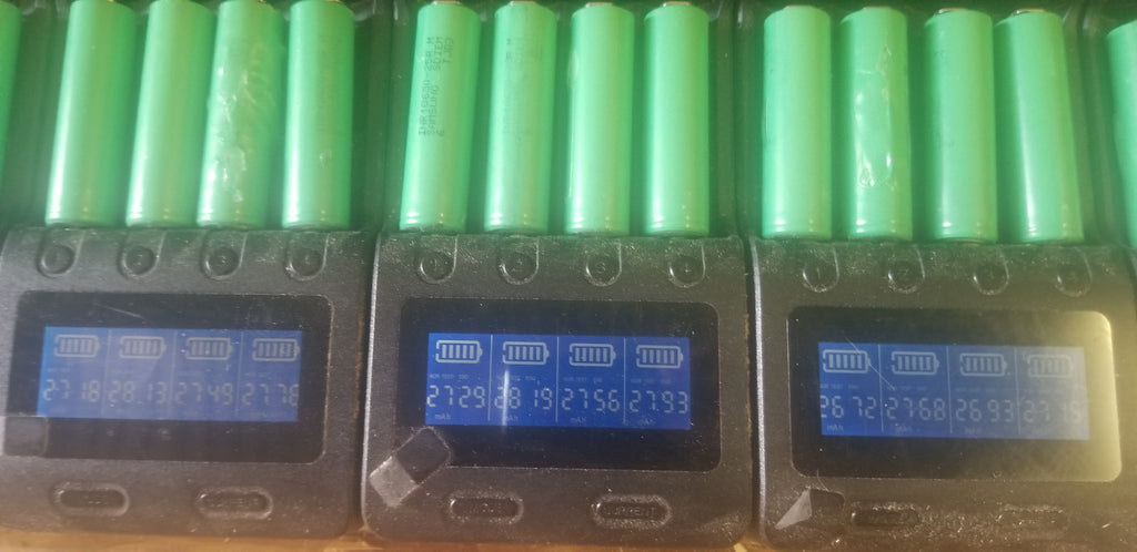 Here are 48 Samsung INR18650-25r cells. These might be the greatest cells available with a perfect balance of high capacity and high amp rating. These cells were salvaged from never cycled battery packs. They all tested above 2500mah in the 2700mah range as shown in the photos. Some cells will have blue or white wrappers on them but when you peel the blue and white wrappers the original green Samsung wrapper will be underneath. Also some cells will have some Kapton tape to patch up small rips in the shrink wrap from being disassembled. The original packs used no spacers so they added another layer of shrink wrap on every other cell in series as a protective layer. If you are building an Ebike or any project that requires high power and high capacity these are a must have.