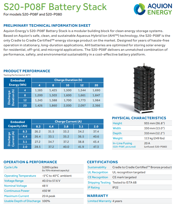 Aquion Energy S20-P08F 48v 47.3ah 2.3kWh Salt Water Battery