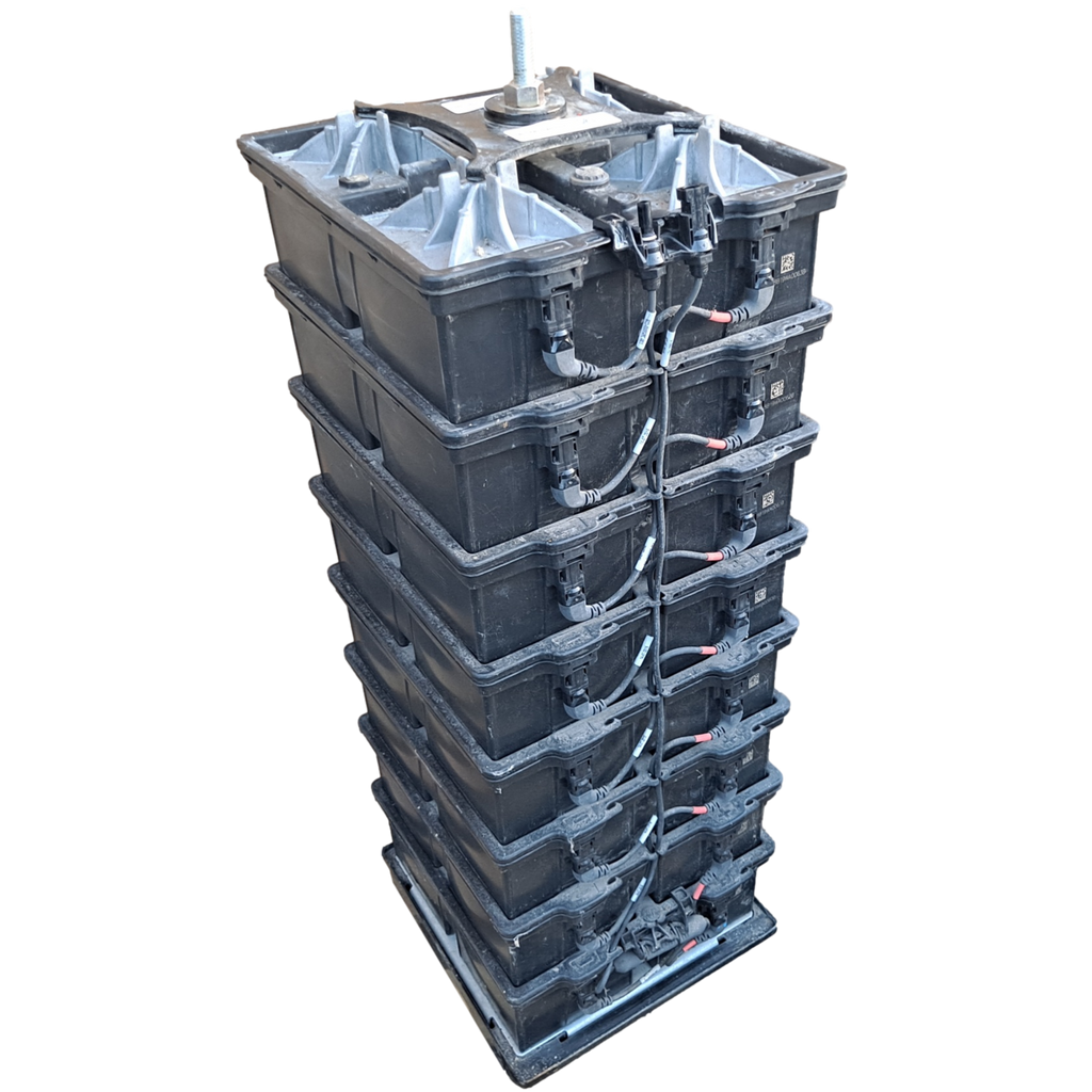These modules are fully discharged at 40v and fully charged at 57.6v. You can charge and discharge up to 450w per stack. Salt Water batteries are meant to cycle at a 0.2c rate or lower. The lower the discharge rate the better performance you will get. Each stack has 8 modules and each of the 8 modules are 6v. 8 in series makes 48v. You get the whole stack of 8 modules already wired in series.
