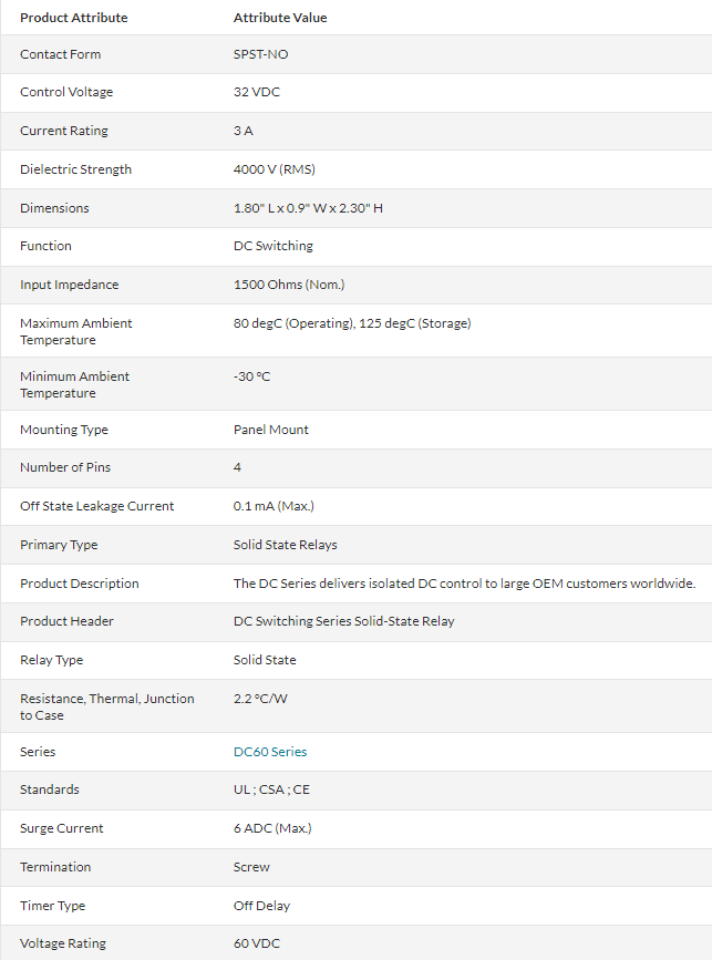 Crydom DC60S3 Solid State Relay 3.5-32vdc to 60vdc 3a