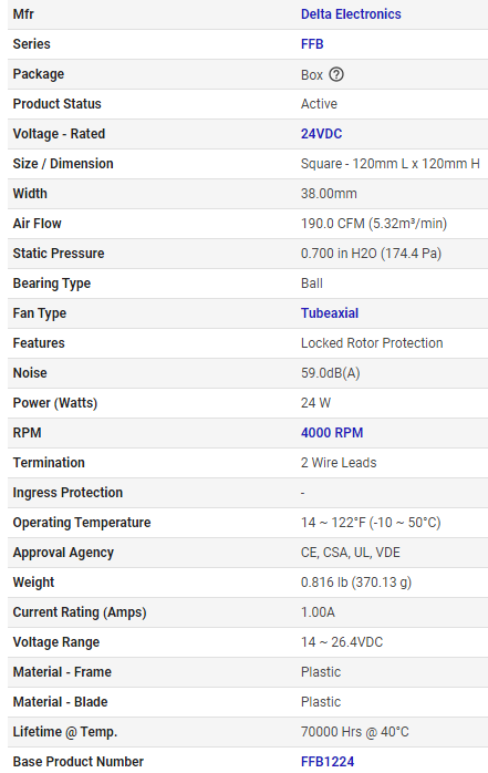 Delta Electronics DC Axial Fan 24v 1.5a Brushless FFB1224EHE