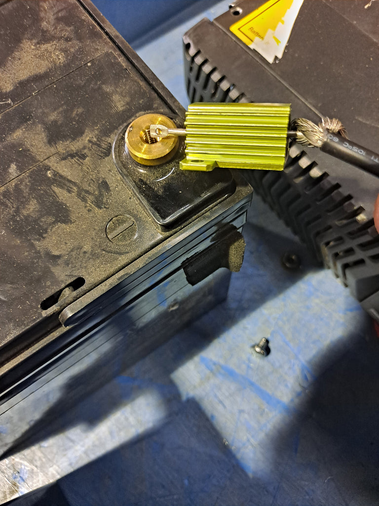 Connect your 36v battery. BEFORE connecting the negative wire use a 25w 30 ohm resistor in line to prevent a spark or really almost any larger resistor will work. This goes for ANY inverter. There are capacitors inside inverters that need to charge first and using the resistor for 2 seconds will charge the capacitors up without a spark. Photo shown in the 4th picture.