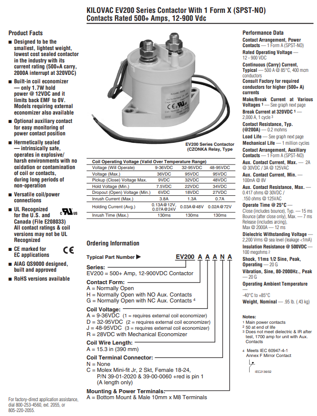 Kilovac EV200A1ANA 500a 0-900vdc Relay 12/24v