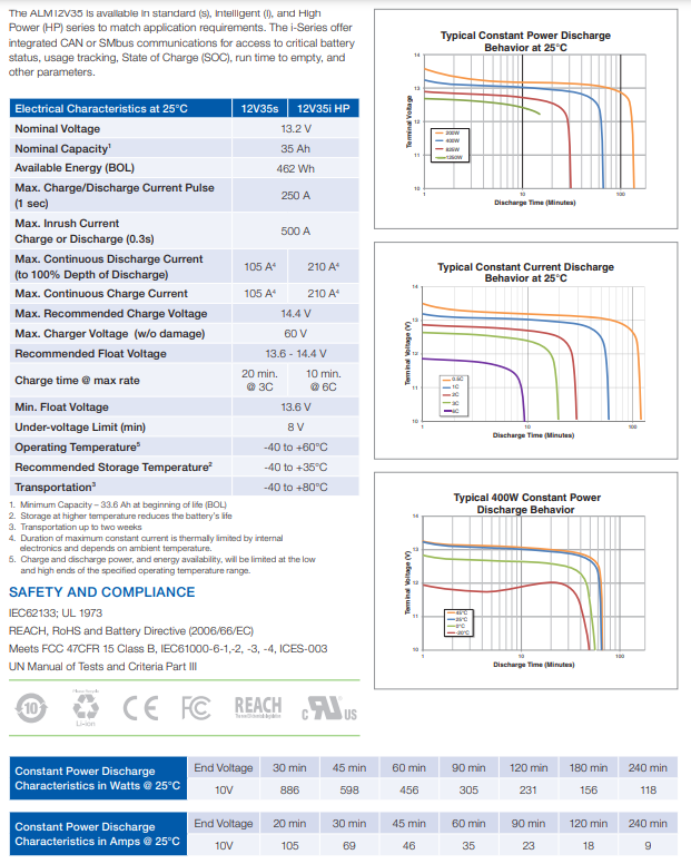 These are very high quality lifepo4 batteries that can also handle up to 210a continuous charge and discharge rates. This is a power lifepo4 module that would be a good candidate for car audio as well. The specs are in the photos. This is the HP version (high power).