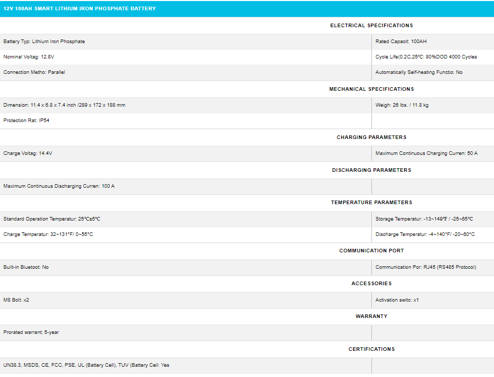 Needs BMS - Renogy 12.8v 100ah Lifepo4 RBT100LFP12S