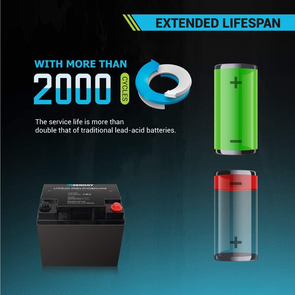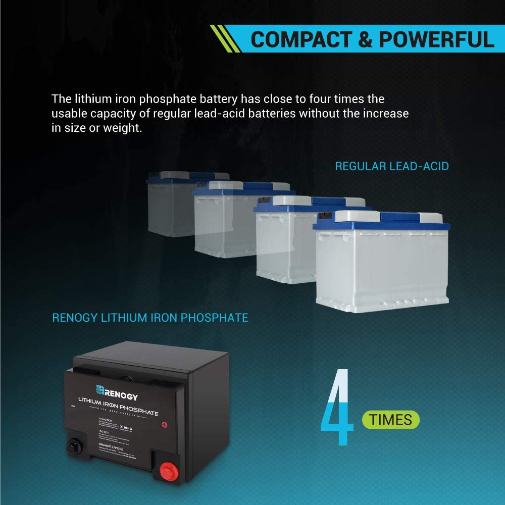 Take your deep cycle battery experience to the next level by investing into Renogy's LFP Battery, combining superior lithium-iron phosphate technology to provide a better solution to solar energy storage. Weighing at just a bit over 14.8 lbs, Renogy's LFP battery surpasses expectation by being lighter, compact, and more powerful than its lead-acid battery counterparts of 50Ah. Designed to replace conventional solar battery storage units such as sealed Sealed, AGM, or Gel batteries, utilize your LFP battery in power-sport applications, off-grid applications, solar energy storage, and more! Take a step into the right direction by pairing your solar system with one of the safest and highest-cycle battery chemistry yet.