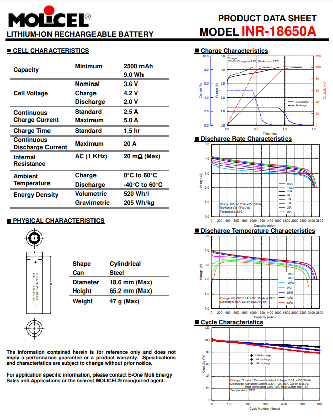 Inside each battery are 2x Molicel INR-18650A 18650 lithium ion cells. They are 3.6v 2500mah and rated for up to 20a continuous discharge.