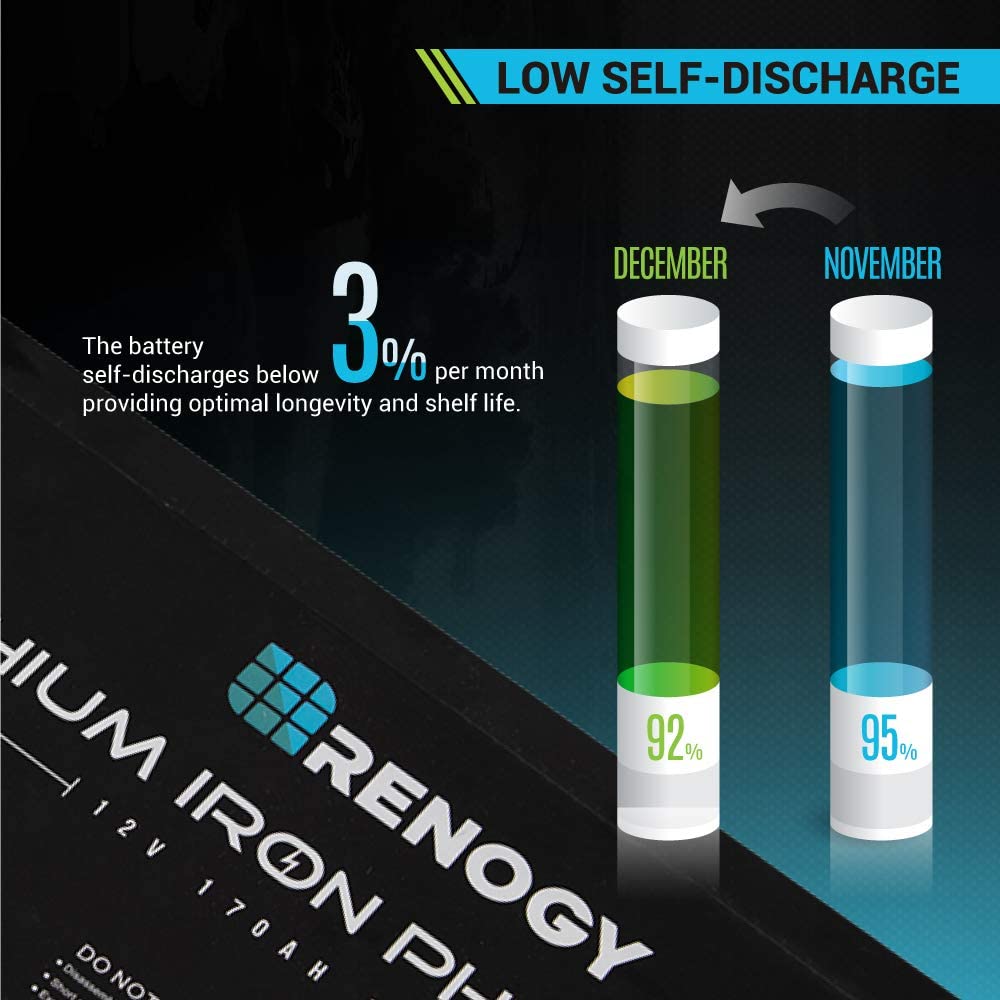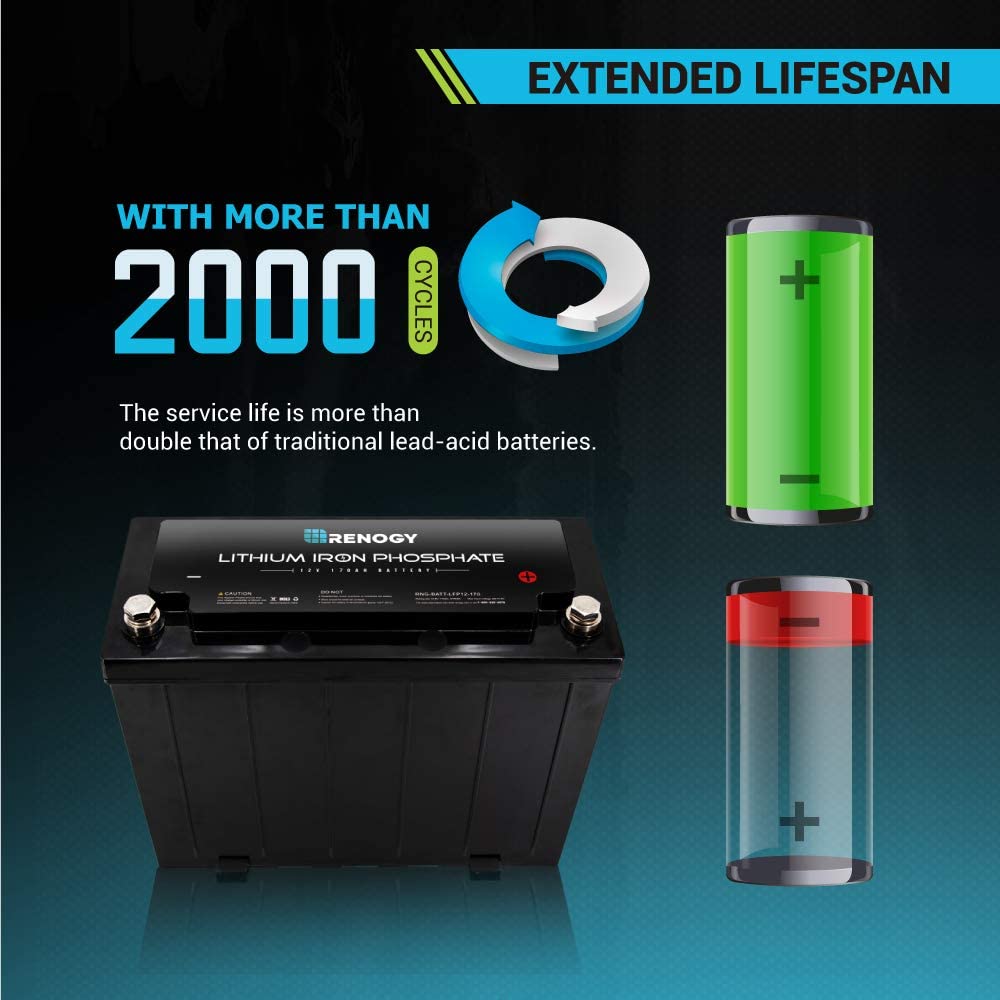 The Renogy 12V 170AH Lithium-Iron Phosphate Battery is perfect for deep-cycle applications including cabins, solar/wind energy systems, UPS battery backups, telecommunication systems, medical equipment, and more. Unlike gel or lead-acid batteries, the Renogy LFP battery is safer, lighter, and more powerful with a long service and shelf life to boot. Invest in this sealed, maintenance-free battery for your off-grid system today!