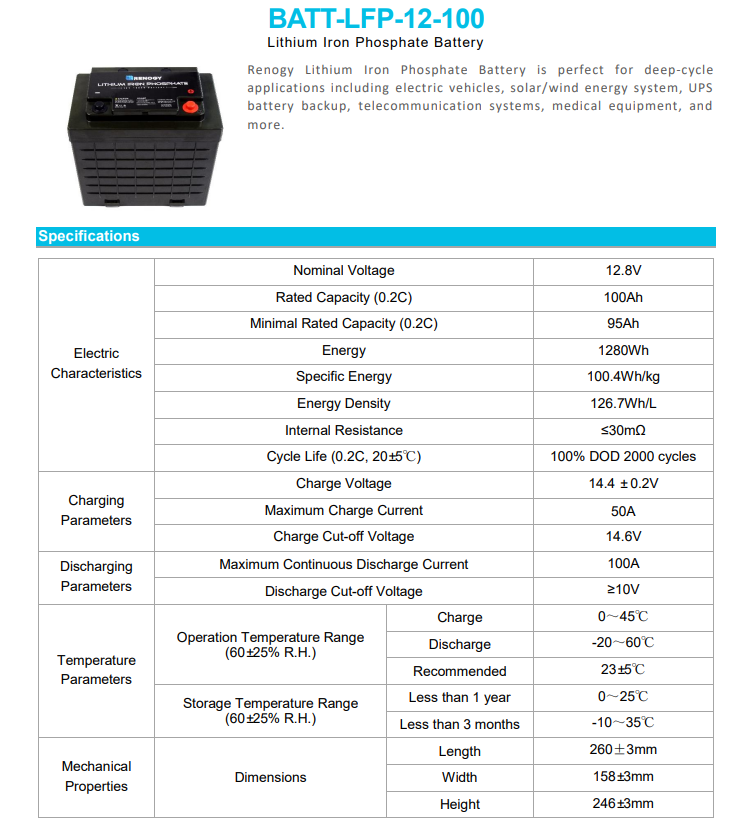 This battery comes with a complete printout of the test report showing capacity and curve charts. Renogy is a popular and trusted brand battery. The value here is a name brand 12v 100ah lifepo4 battery with a BMS.