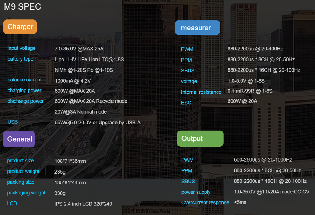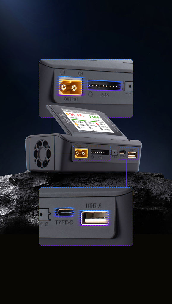 Here are brand new ToolKitRC M9 chargers. These can charge, balance charge, discharge, and even can perform a regenerative discharge. That means if you power this unit with another battery, when you discharge you can have that energy go back into the battery while you are testing capacity. You get the item exactly as shown in the 2nd photo, new in the unopened box. These are perfect for balance charging up to 8s batteries. The xt60 connectors are not included. You can use a power supply up to 600w to power this up or a battery with an xt60 connector. These work with standard jst connectors for the balance lead connectors. You can fit up to a 9 pin jst connector for testing 8s batteries but any jst connector will work. For example if you have a 12v battery with a 5 pin jst connector for balance leads you can plug it in on the left side.