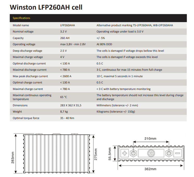 Winston 3.2v 260ah LYP260AHA Prismatic Lifepo4