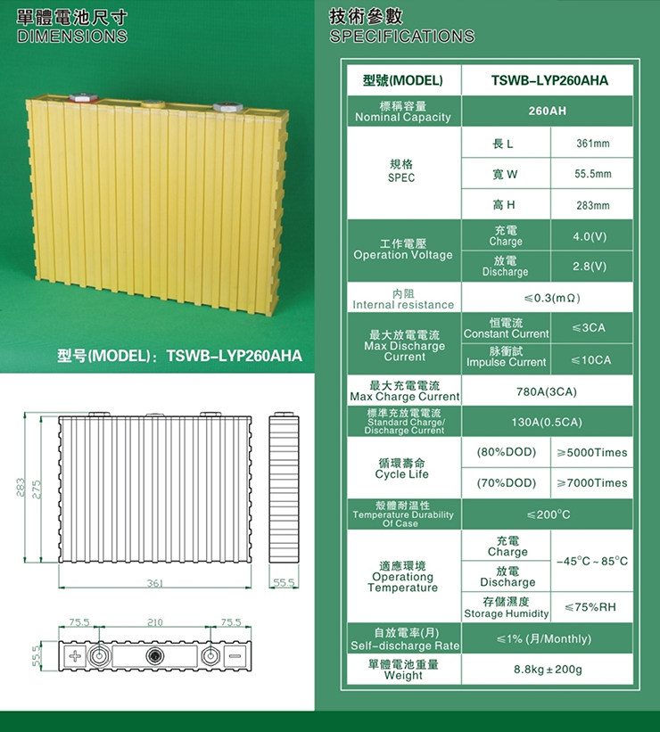 Datasheets and specs are in the 2nd and 3rd photos. The model of these are LYP260AHA. Sometimes you will see a TS in front of those numbers and that just means they were manufactured for Thunder Sky, these have a V in front. Same specs, same manufacturer.
